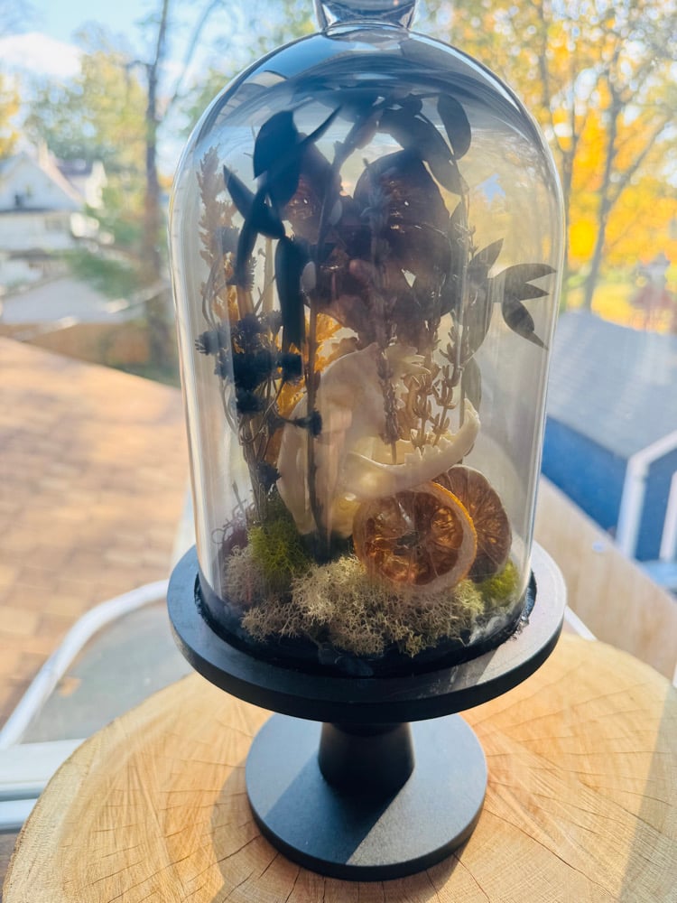 Large Standing Terrarium featuring a beautiful cat skull, moss, dried fruit, and butterfly