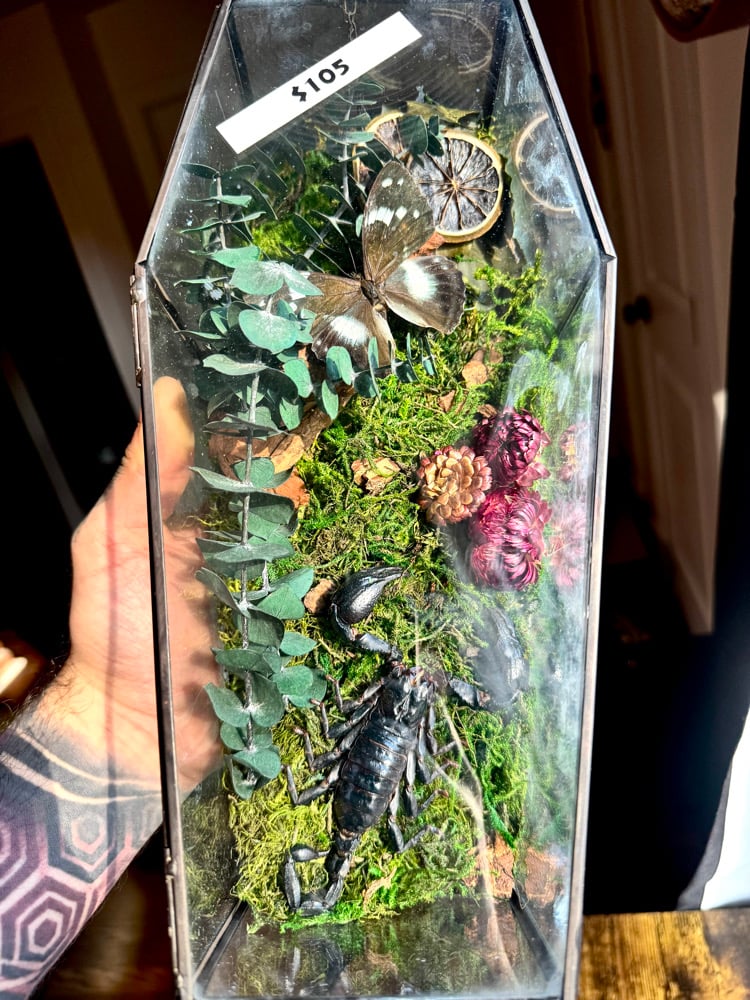 Coffin shaped terrarium featuring a large black scorpion and butterfly with eucalyptus, moss, dried fruit, and flower succulents.